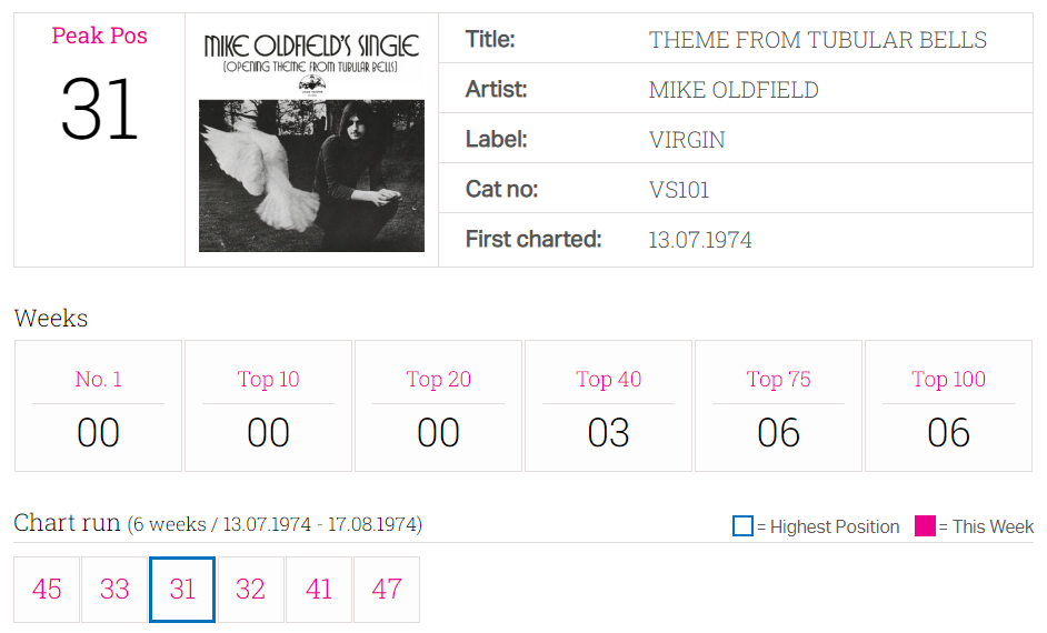 Las ventas comenzaron a aumentar constantemente tras el estreno de El exorcista. Desde febrero de 1974 hasta mayo de 1975, el álbum pasó solo cuatro semanas fuera del top ten del Reino Unido y durante este tiempo, después de pasar diez semanas consecutivas en el número 2 detrás de Band on the Run (1973) de los Wings de Paul McCarney y del segundo álbum de Oldfield Hergest Ridge (1974), Tubular Bells finalmente alcanzó el puesto número uno en la semana que terminó el 5 de octubre de 1974, dieciséis meses después de su lanzamiento. Al superar a Hergest Ridge como el álbum número uno, Oldfield se convirtió en el segundo artista en la historia en reemplazarse a sí mismo en la cima de la lista de álbumes del Reino Unido, después de que The Beatles lo lograron una vez en 1963 y otra vez en 1964. La hazaña fue lograda más tarde por Michael Jackson y David Bowie, ambas veces después de su muerte.